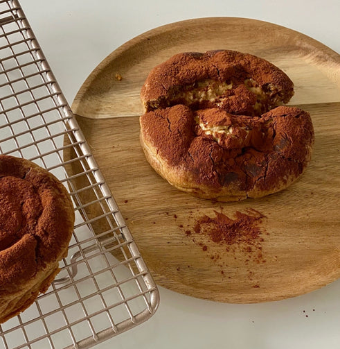 A premium chocolate cookie with a homemade coffee cream cheese filling topped with a layer of pure cocoa powder.