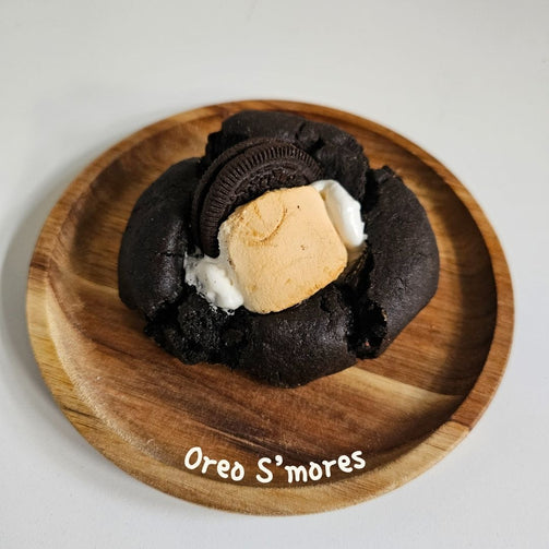 Dark chocolate cookie with a gooey marshmallow-chocolate filling, topped with an Oreo. Basically a campfire dessert, but make it ugly.