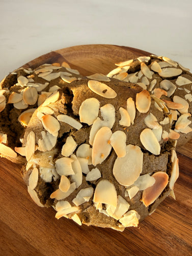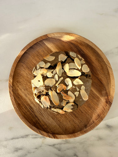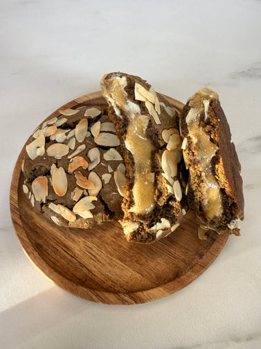 A high quality Hojicha (Japanese roasted green tea) cookie filled with almond buttercream, white chocolate, and topped with crunchy almond flakes.