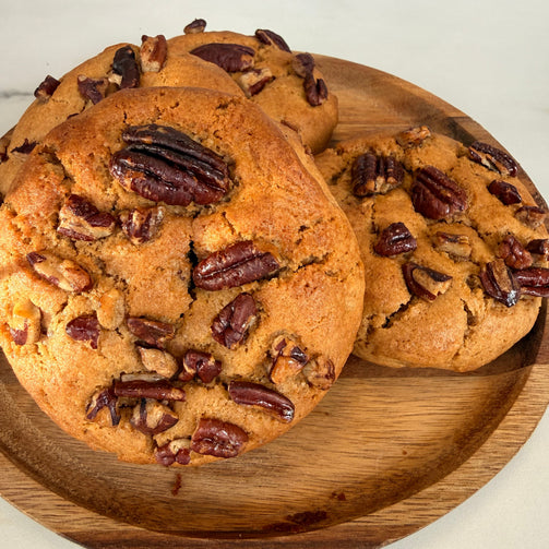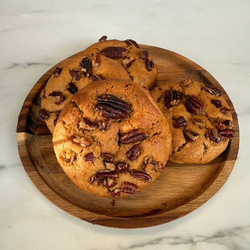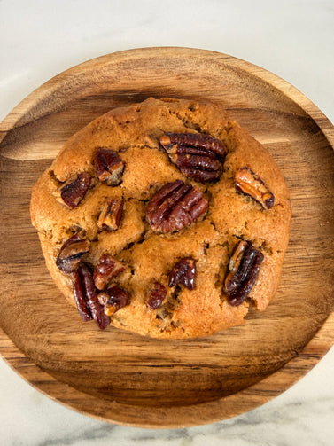 A maple-kissed cookie filled with toasted pecans and topped with maple candied pecans. Sweet, nutty & full of autumn vibes.